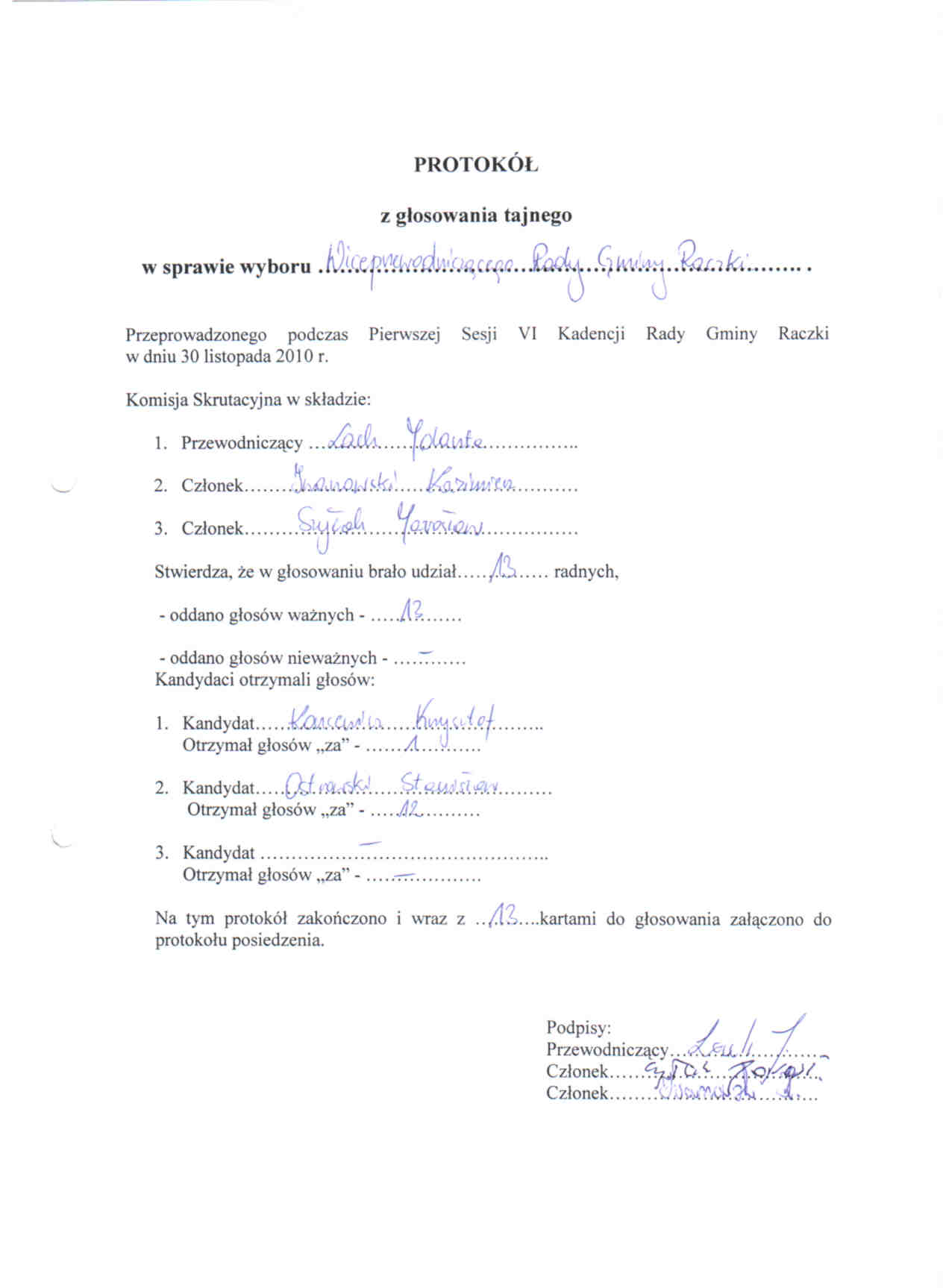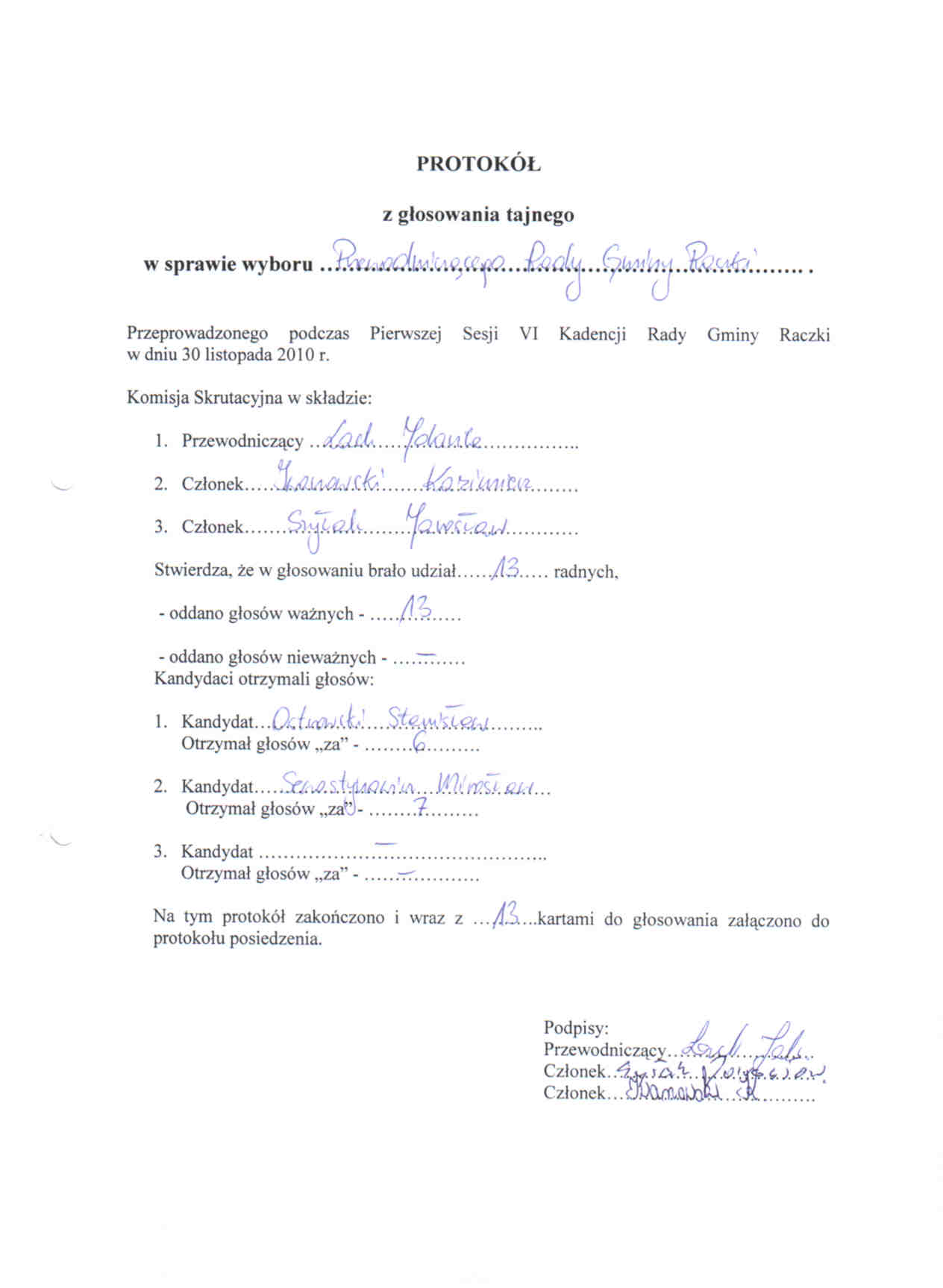 Załącznik Nr 2. – Uchwała Nr I/1/10 Rady Gminy Raczki z dnia 30 listopada 2010r. w sprawie wyboru Przewodniczącego Rady Gminy Raczki