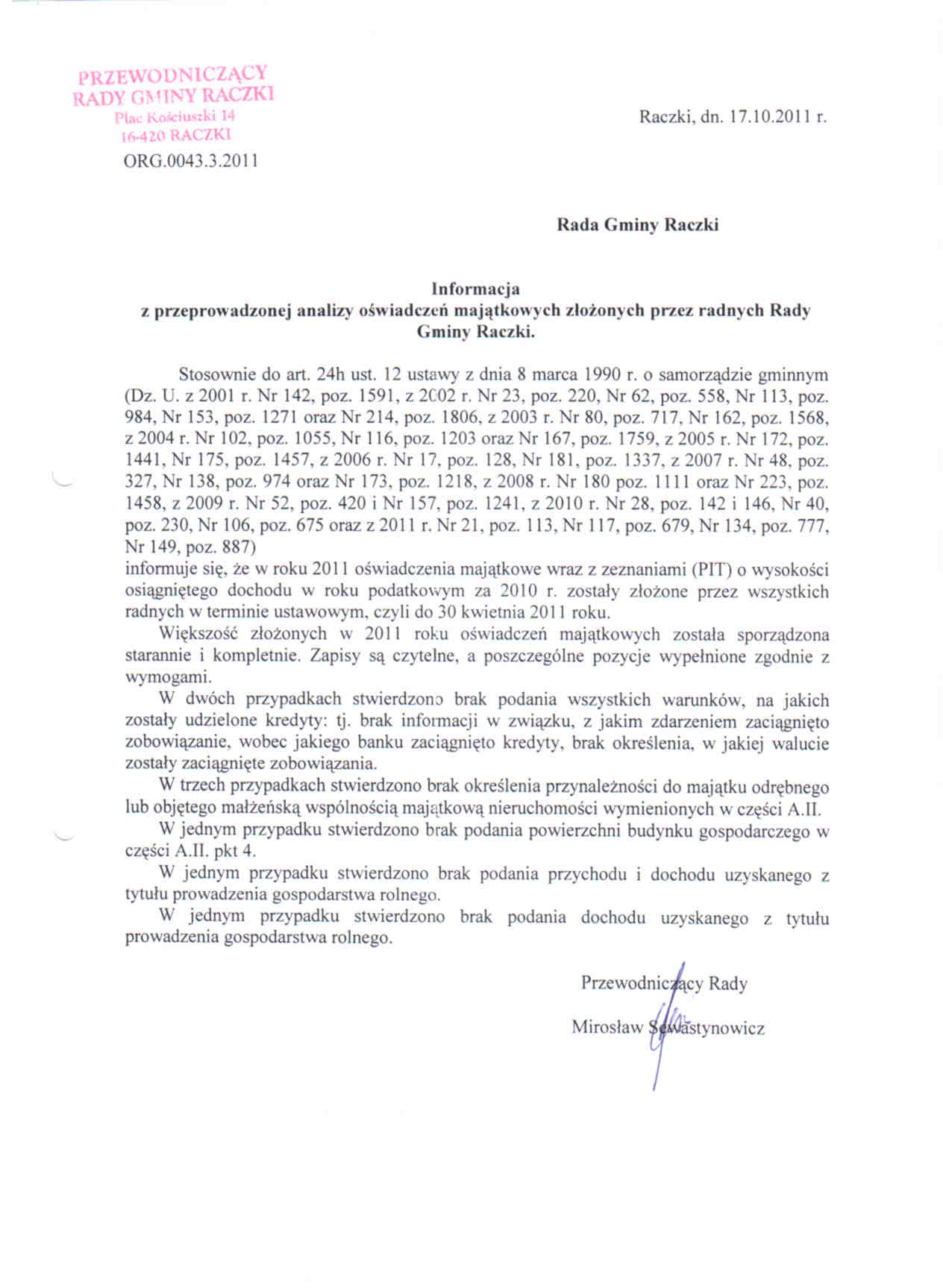 Załącznik Nr 2. – Informacja z przeprowadzonej analizy oświadczeń majątkowych złożonych przez radnych Rady Gminy Raczki