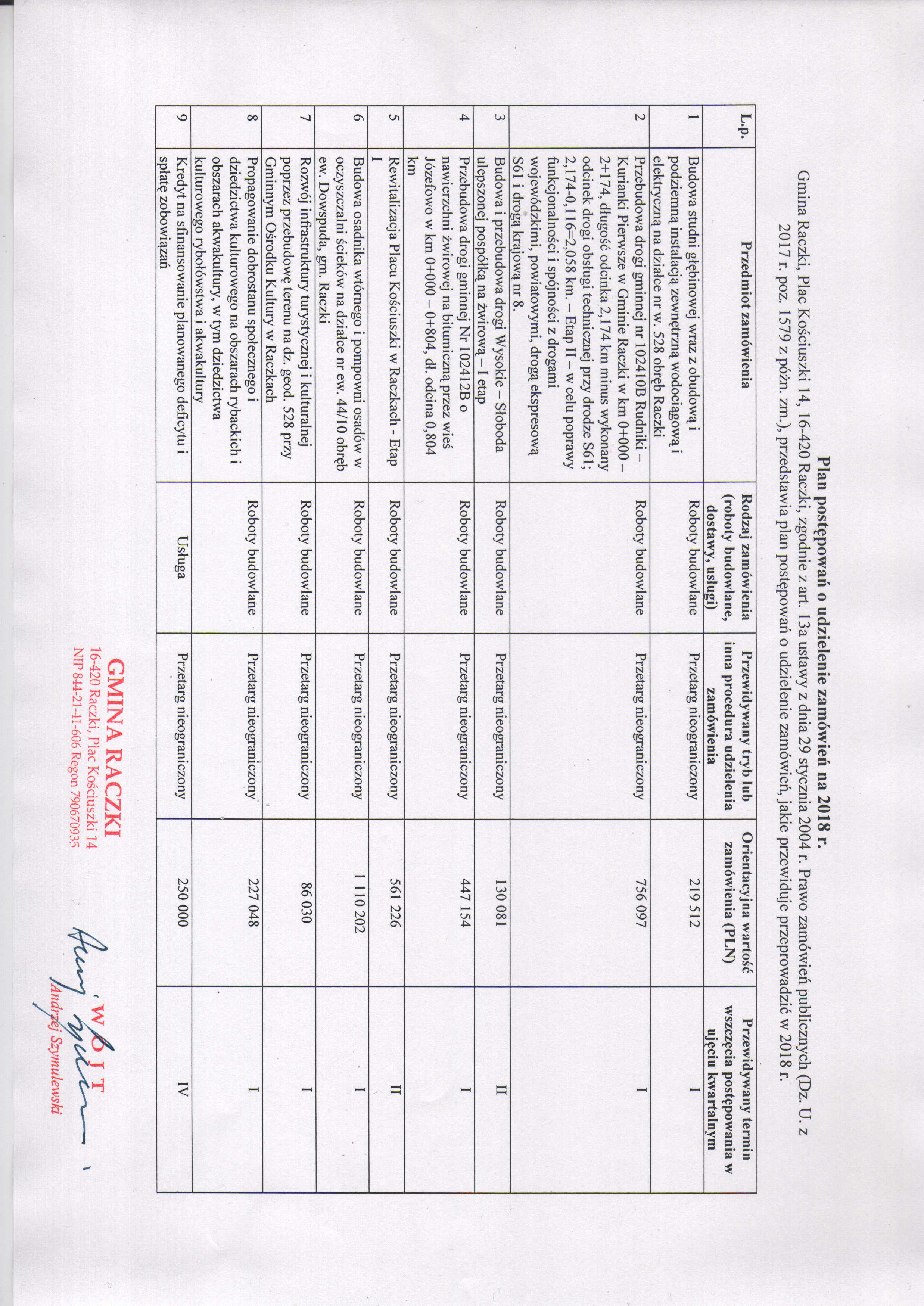| Otwarty konkurs ofert na realizację zadań publicznych przez organizacje pozarządowe i podmioty wymienione w art. 3 ust. 3 ustawy z dnia 24 kwietnia 2003 r. o działalności pożytku publicznego i o wolontariacie . Przebudowa drogi gminnej nr 102410B Rudniki - Kurianki Pierwsze w Gminie Raczki w km 0+000 - 2+174, długość odcinka 2,174 km minus wykonany odcinek drogi obsługi technicznej przy drodze S61; 2,174-0,116=2,058 km. - Etap II - w celu poprawy funkcjonaln . Budowa osadnika wtórnego i pompowni osadów w oczyszczalni ścieków na działce nr ew. 44/10 obręb ew. Dowspuda, gm. Raczki, realizowana w ramach operacji: Budowa infrastruktury wodno-ściekowej w Gminie Raczki . Budowa studni głębinowej wraz z obudową i podziemną instalacją zewnętrzną wodociągową i elektryczną na działce nr w. 528 obręb Raczki, realizowana w ramach operacji: Budowa infrastruktury wodno-ściekowej w Gminie Raczki . Rozwój infrastruktury turystycznej i kulturalnej poprzez przebudowę terenu na dz. geod. 528 przy Gminnym Ośrodku Kultury w Raczkach . Przebudowa drogi gminnej Nr 102412B o nawierzchni żwirowej na bitumiczną przez wieś Józefowo w km 0+000 – 0+804, dł. odcina 0,804 km . Mała architektura w miejscach publicznych, place zabaw dla dzieci i siłownia zewnętrzna na terenie Gminy Raczki w ramach zadania: „Propagowanie dobrostanu społecznego na obszarze Gminy Raczki poprzez organizację miejsc aktywnego wypoczynku oraz pro . Budowa studni głębinowej wraz z obudową i podziemną instalacją zewnętrzną wodociągową i elektryczną na działce nr w. 528 obręb Raczki, realizowana w ramach operacji: Budowa infrastruktury wodno-ściekowej w Gminie Raczki - II przetarg . Rozwój infrastruktury turystycznej i kulturalnej poprzez przebudowę terenu na dz. geod. 528 przy Gminnym Ośrodku Kultury w Raczkach - II przetarg . Rewitalizacja Placu Kościuszki w Raczkach - Etap I . Budowa i przebudowa drogi wewnętrznej Wysokie-Słoboda w km 0+00 do 0+612,81 o nawierzchni ulepszonej żwirem na nawierzchnię żwirową, o długości 0,61281 km - odcinek II . Przebudowa drogi gminnej Nr 102409B o nawierzchni żwirowej na bitumiczną Stoki - Kurianki Pierwsze w km 0+000 - 0+720, dł. odcinka 0,72 km . Przebudowa, rozbudowa, dobudowa i nadbudowa budynku strażnicy OSP Raczki w celu utworzenia sali widowiskowo-koncertowej – etap I, przy realizacji zadania pn.: Remont i rozbudowa Gminnego Ośrodka Kultury w Raczkach w ramach Programu Infrastruktura dom . Udzielenie i obsługa kredytu długoterminowego do kwoty 2.633.819 zł (słownie: dwa miliony sześćset trzydzieści trzy tysiące osiemset dziewiętnaście złotych) z przeznaczeniem na pokrycie planowanego deficytu budżetu gminy w kwocie – 949.103 z . |